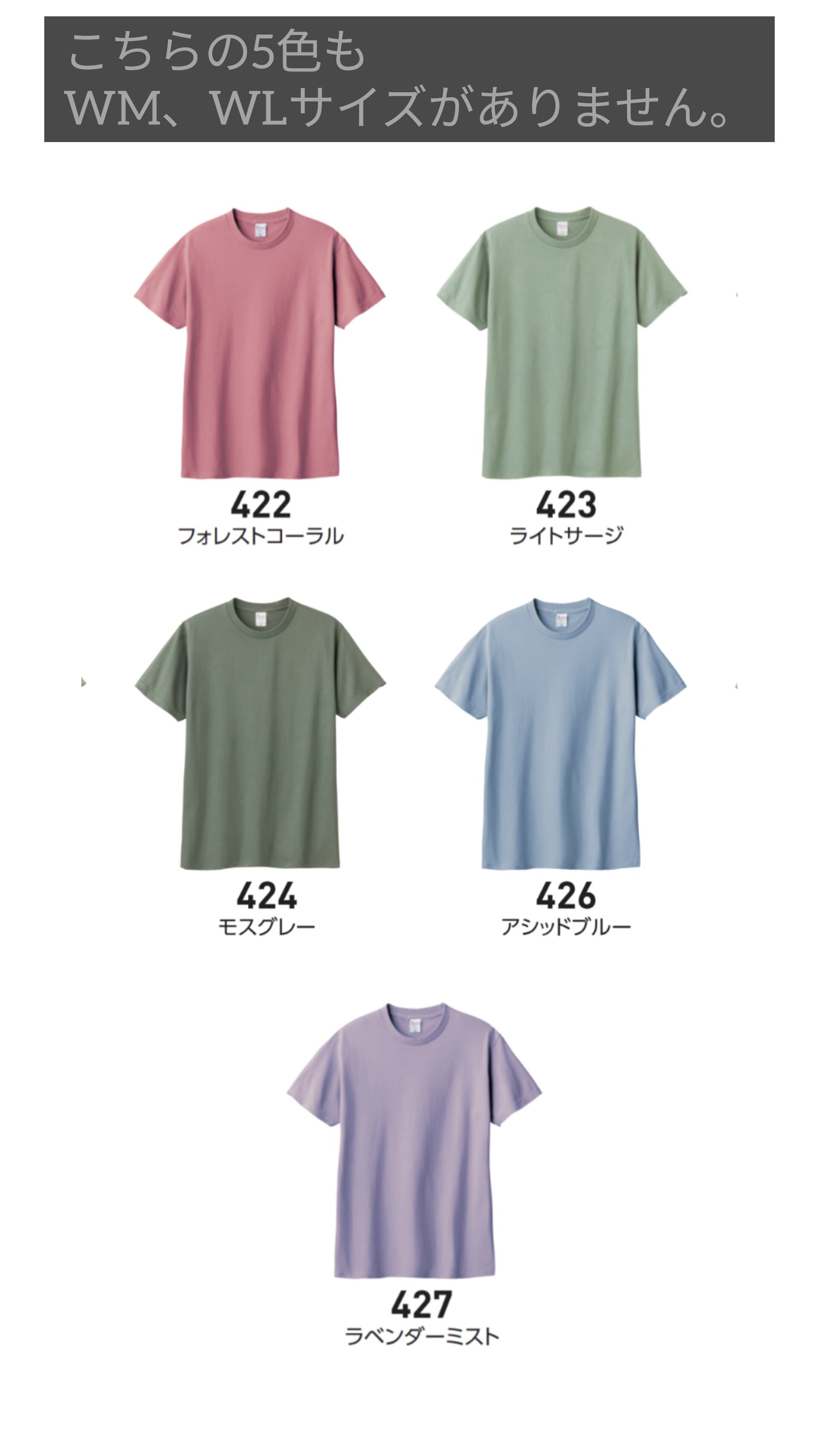 画像が別になっている、ライトベージュ、ダスティピンク、ダスティブルー、サンドカーキ、キャメル、ダークブラウン、フォレストコーラル、ライトセージ、モスグレー、アシッドブルー、ラベンダーミストはWM、WLサイズがありません。150、160、S〜XXXLの8サイズ展開になります。